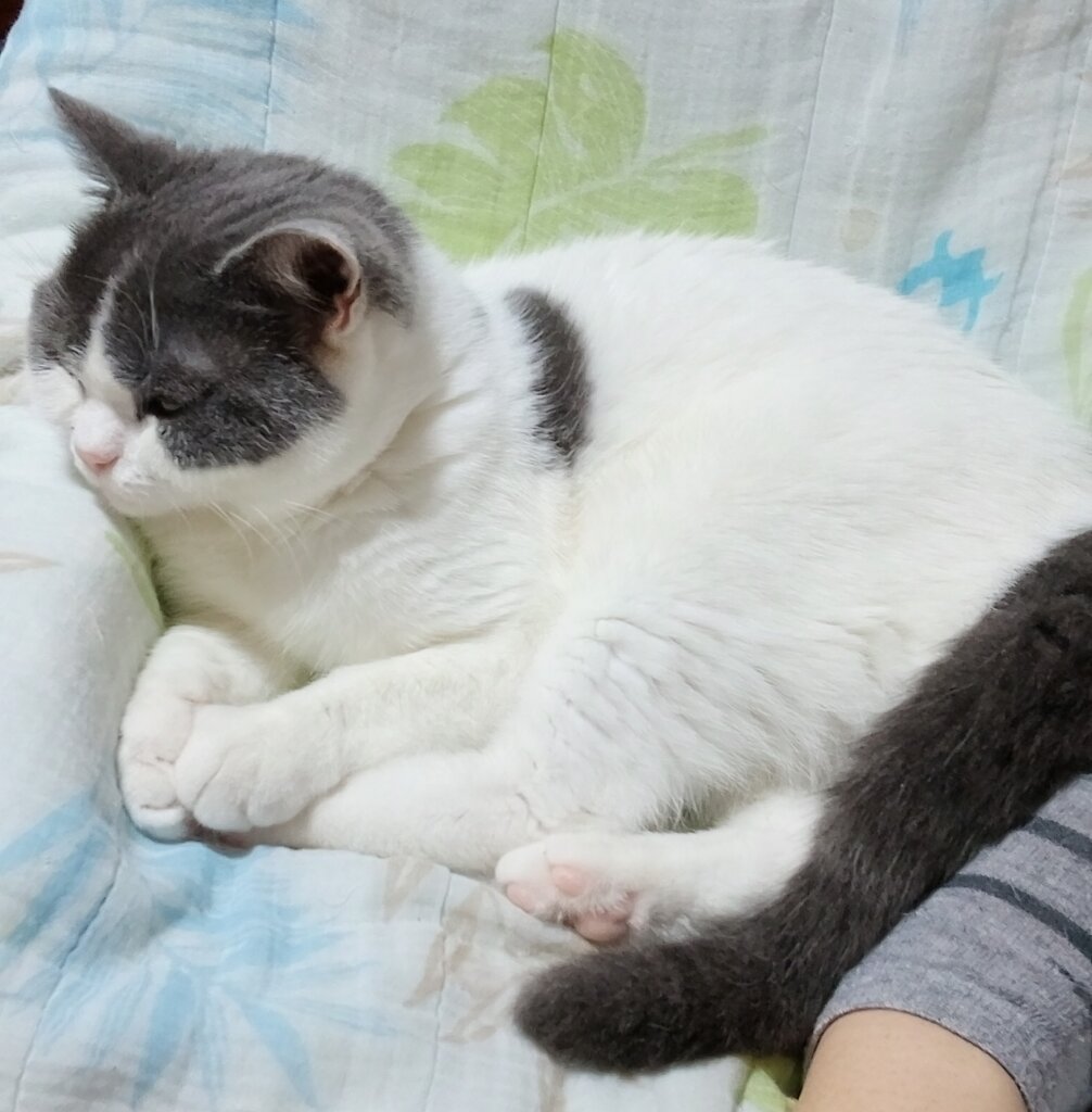 3枚目のしょうちゃんの写真は、私がミシンのあとお茶を飲みながら休憩していると足元に来て、くつろぎ始めたときのものです。